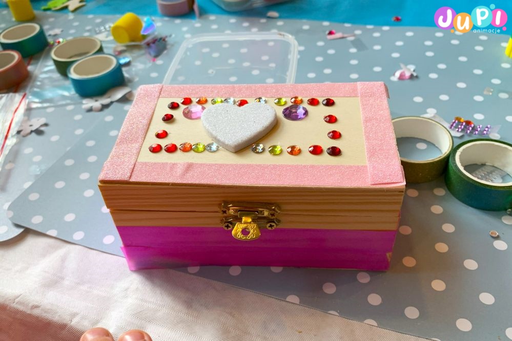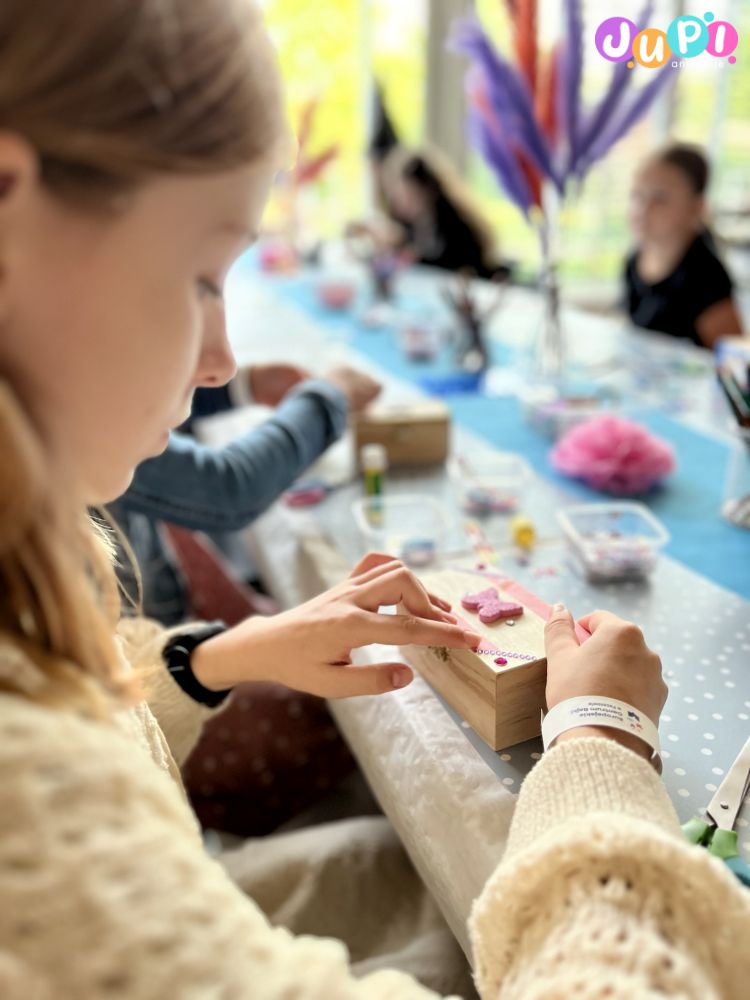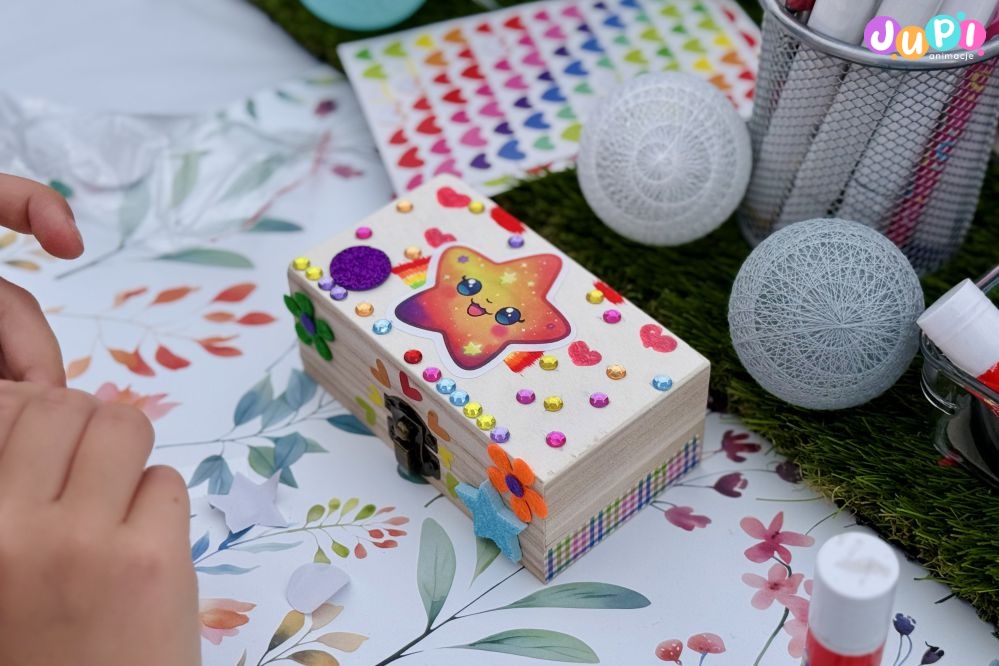 Podczas zajęć dzieci eksperymentują z barwami, fakturami i ozdobami, łącząc elementy w oryginalne kompozycje. To przestrzeń na twórczą swobodę, własne pomysły i artystyczne odkrycia. Każde pudełko opowiada inną historię i staje się osobistą, niepowtarzalną pamiątką.